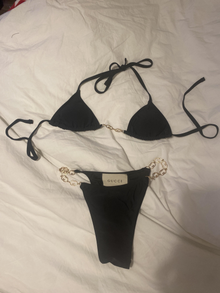 Getragener gucci Bikini in schwarz als set mit Goldenen Monogramm getragen von 18 jährigen Mädchen